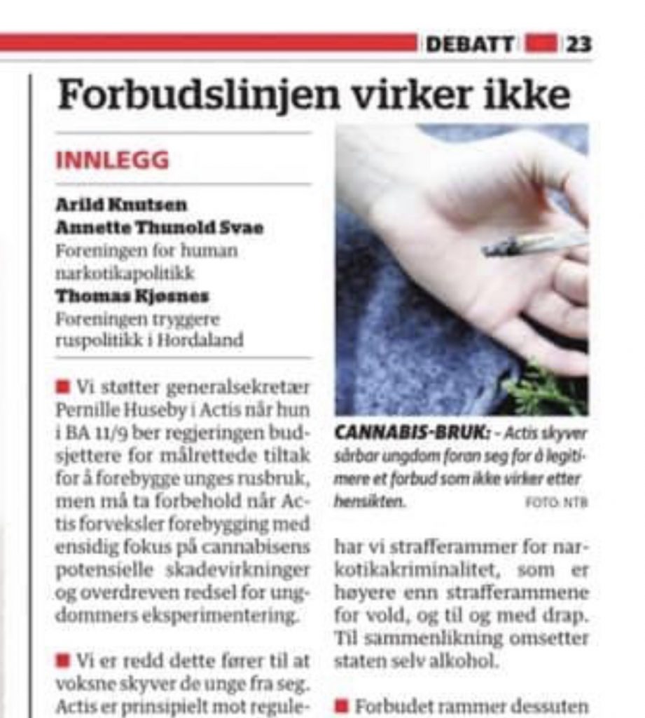 Debattinnlegg i Bergensavisen 23. september 2019. Av Arild Knutsen og Annette Thunold Svae i Foreningen for human narkotikapolitikk og Thomas Kjøsnes i Foreningen Tryggere Ruspolitikk, Hordaland.