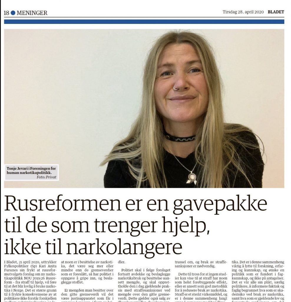 Debattinnlegg i Stjørdals Blad, av Tonje Jevari i Foreningen for human narkotikapolitikk.